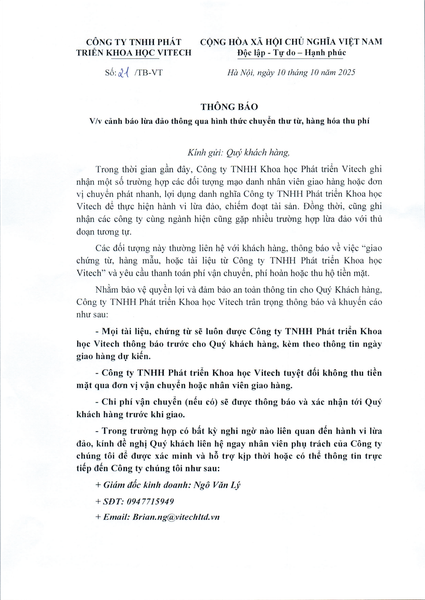 Gần đây, Công ty TNHH Phát triển Khoa học Vitech ghi nhận một số trường hợp đối tượng mạo danh nhân viên giao hàng hoặc đơn vị chuyển phát nhanh, lợi dụng công ty Vitech để thực hiện hành vi lừa đảo, chiếm đoạt tài sản.